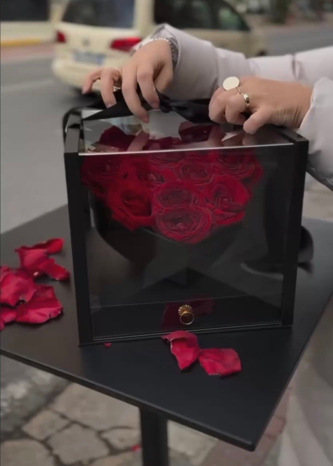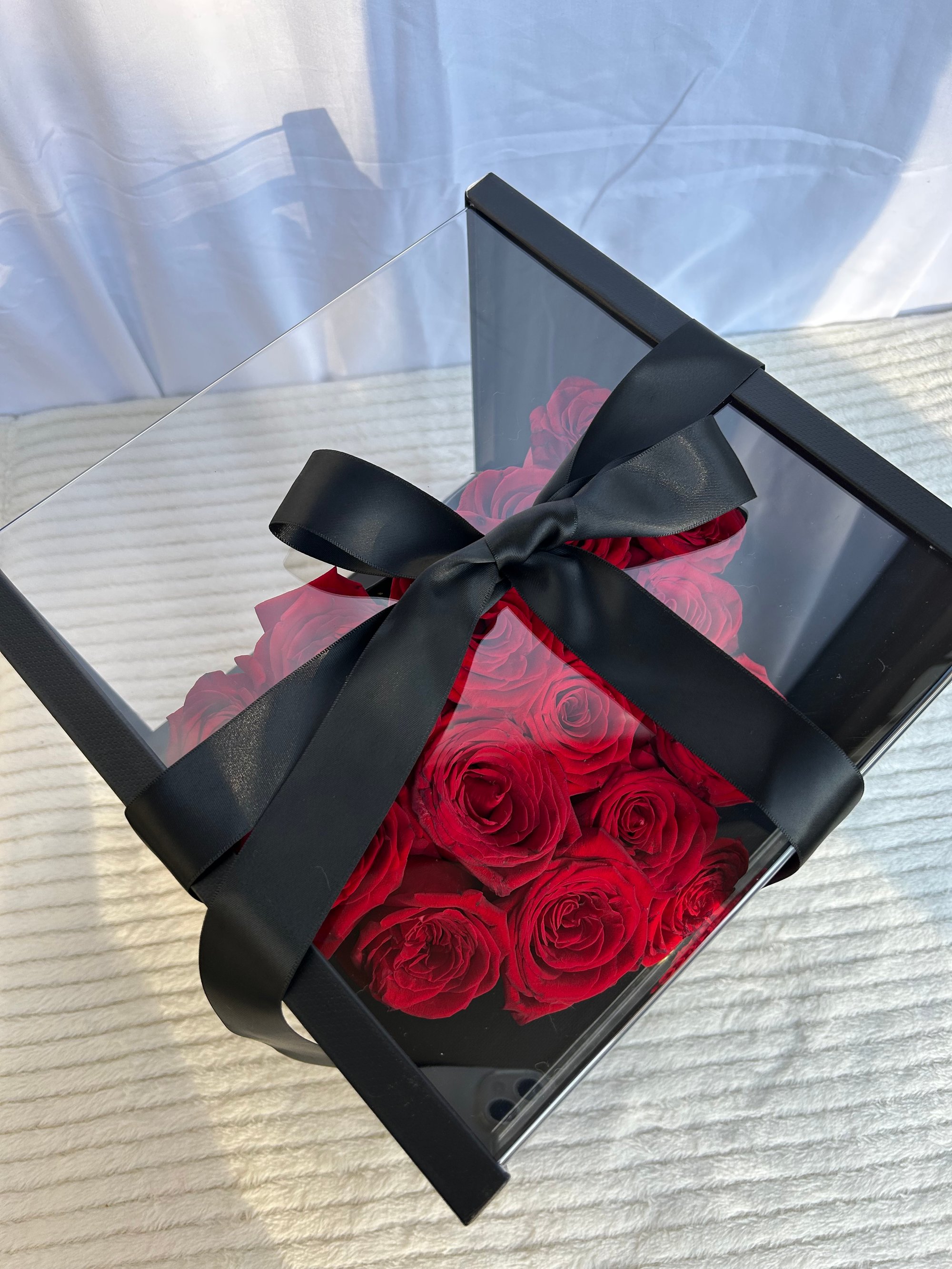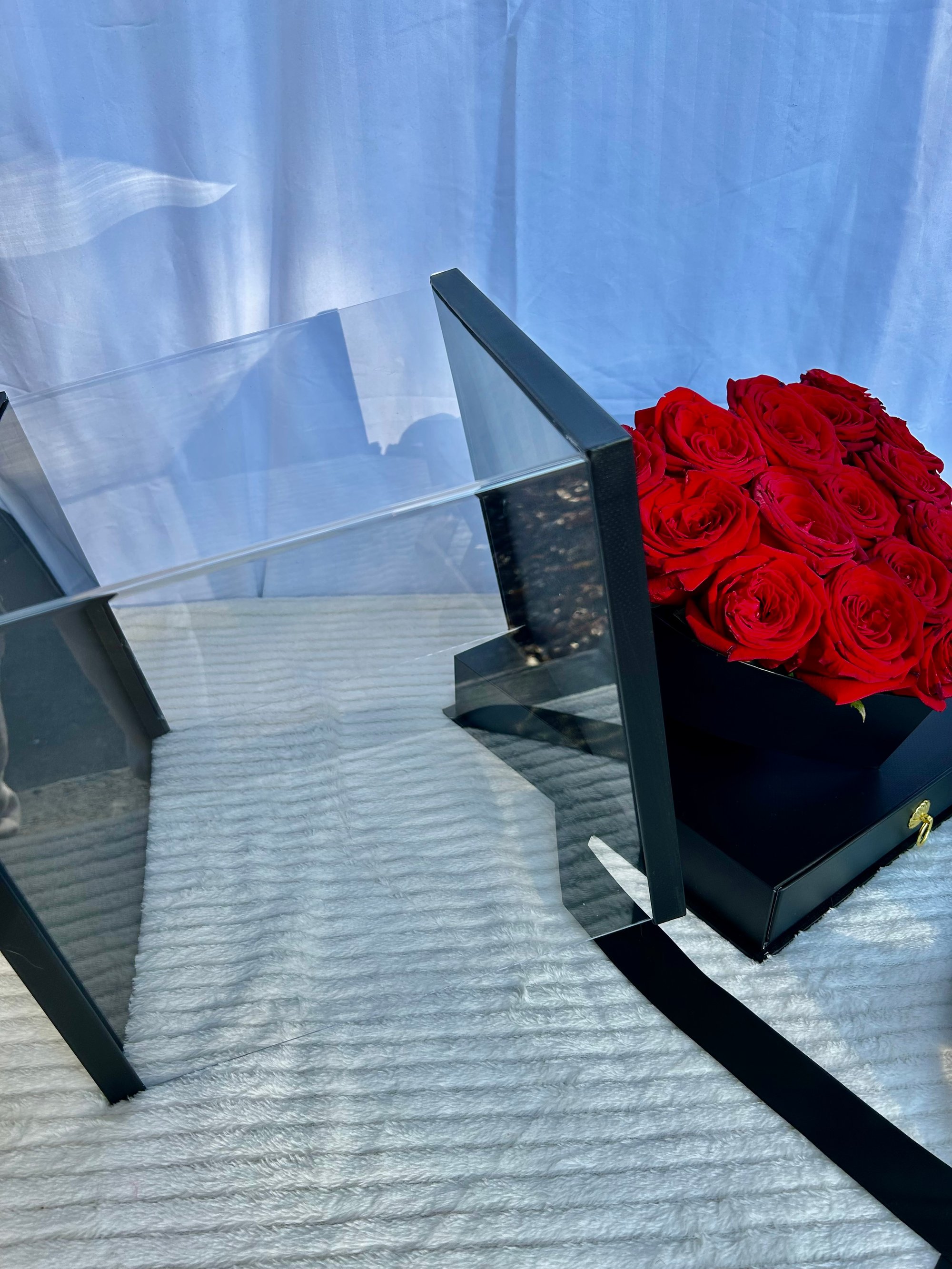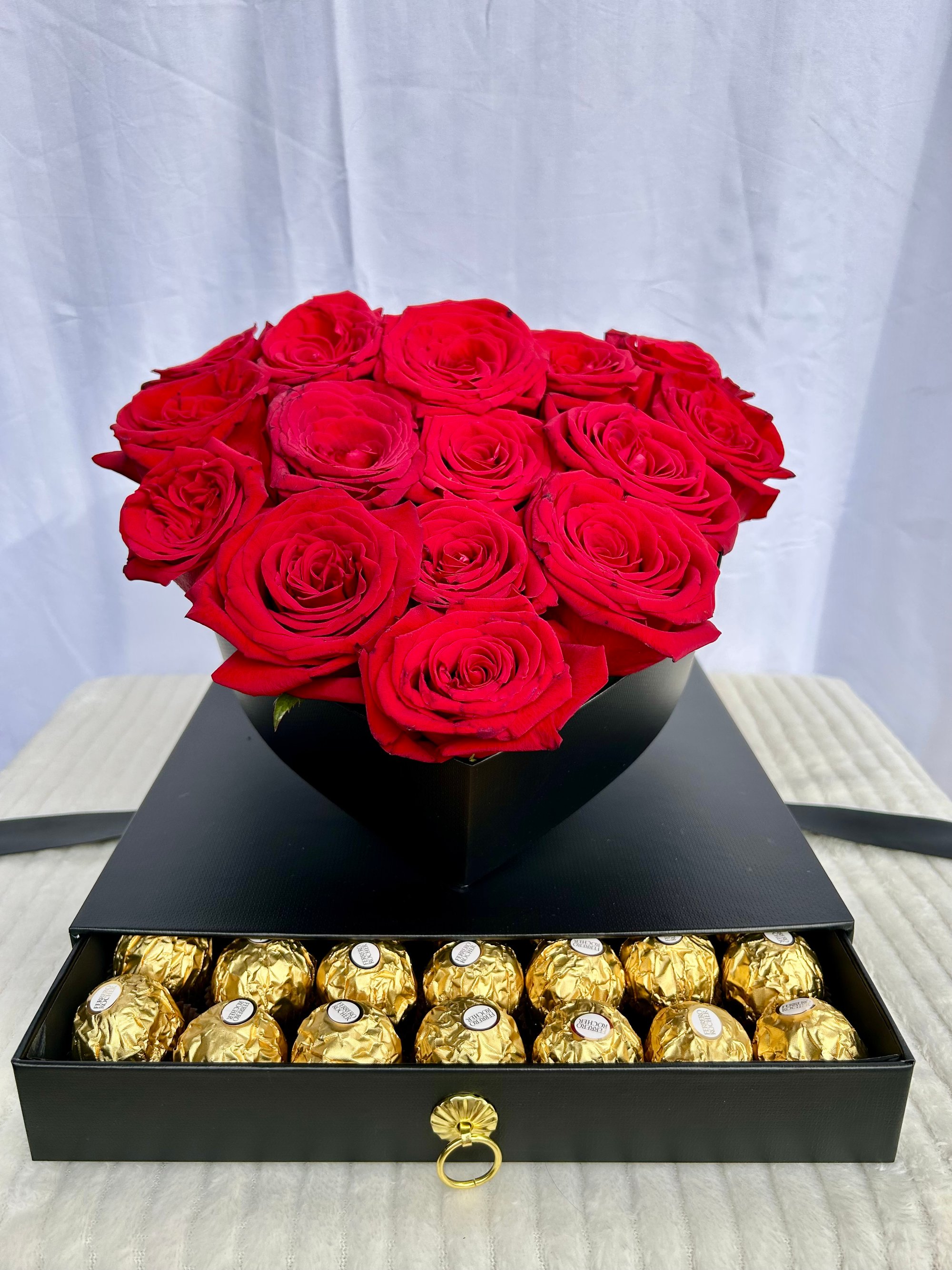 Luna Obsession features 15 premium red roses arranged in a modern heart design, encased in a sleek black acrylic display box finished with our signature ribbon detail. Beneath the roses, a hidden drawer reveals 49 Ferrero Rocher chocolates — an indulgent surprise made to impress.