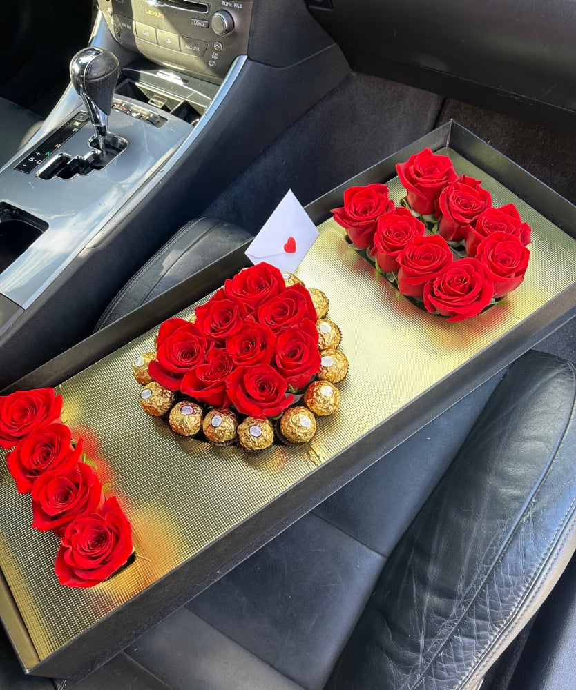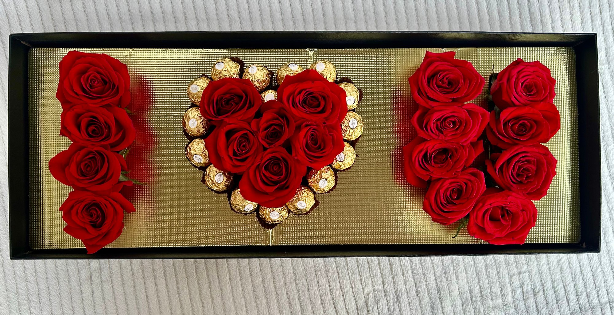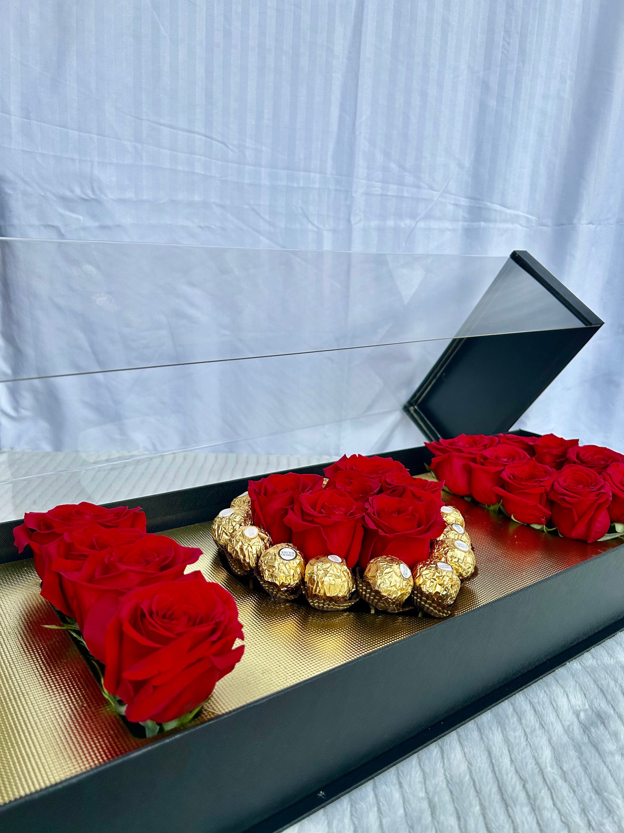 Luna Devotion features 18 luxurious red roses, carefully arranged in a sleek black “I Love You” keepsake acrylic box. At its center, a halo of 16 Ferrero Rocher chocolates adds a golden touch of indulgence — the perfect balance of romance and sweetness.